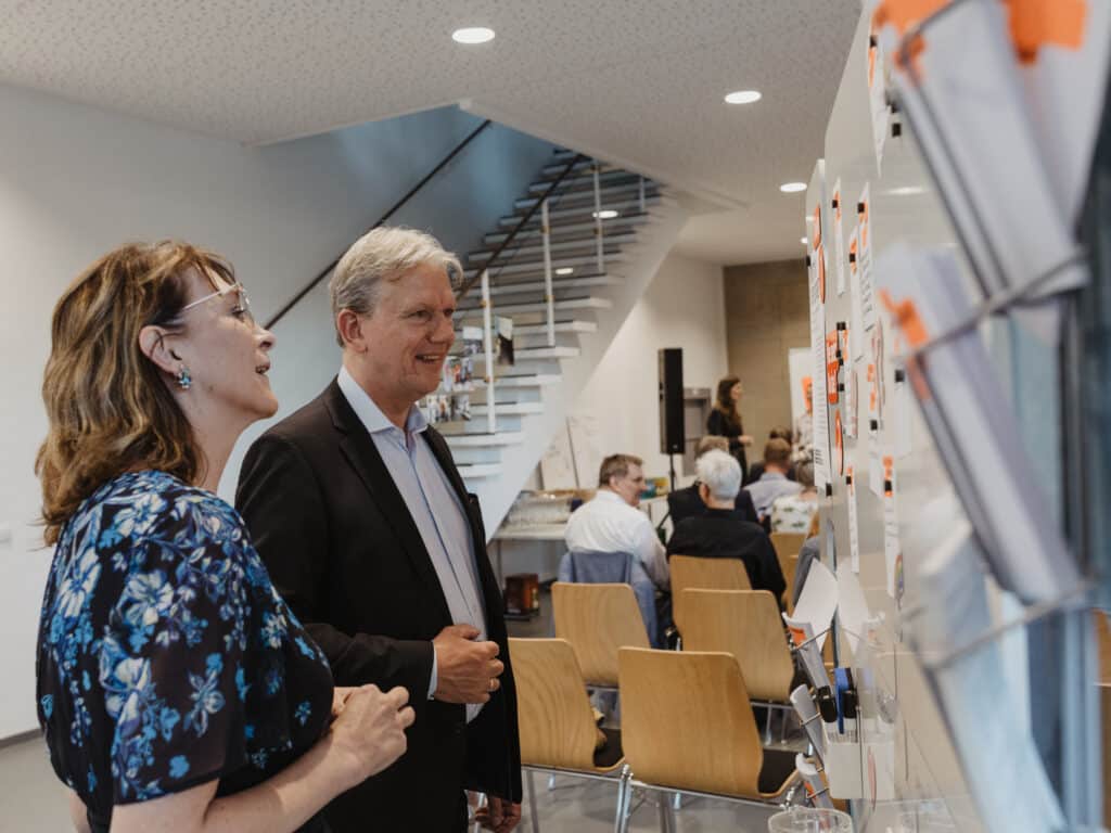 Ein besonderes Highlight der Eröffnungstage war die Einweihung des Prototypen unseres Bürger:innenbeteiligungsdisplay („Civic Engagement Display“) gemeinsam mit unseren Besucher:innen. Nicht nur bei unseren Tagen der offenen Tür am 02. und 03. Juni, sondern bei allen unseren Veranstaltungen wurde dieses rege genutzt. Das weiße Board mit Abstimmungsboxen lädt durch Fragen auf Notizzetteln dazu ein, allein oder auch gemeinsam zu diskutieren, mit welchen Erwartungen und Fragen wir dem Rechtsstaat begegnen.