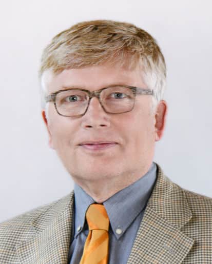 Porträt eines mittelalten Mann mit brauner Brille und im Anzug mit oranger Krawatte.