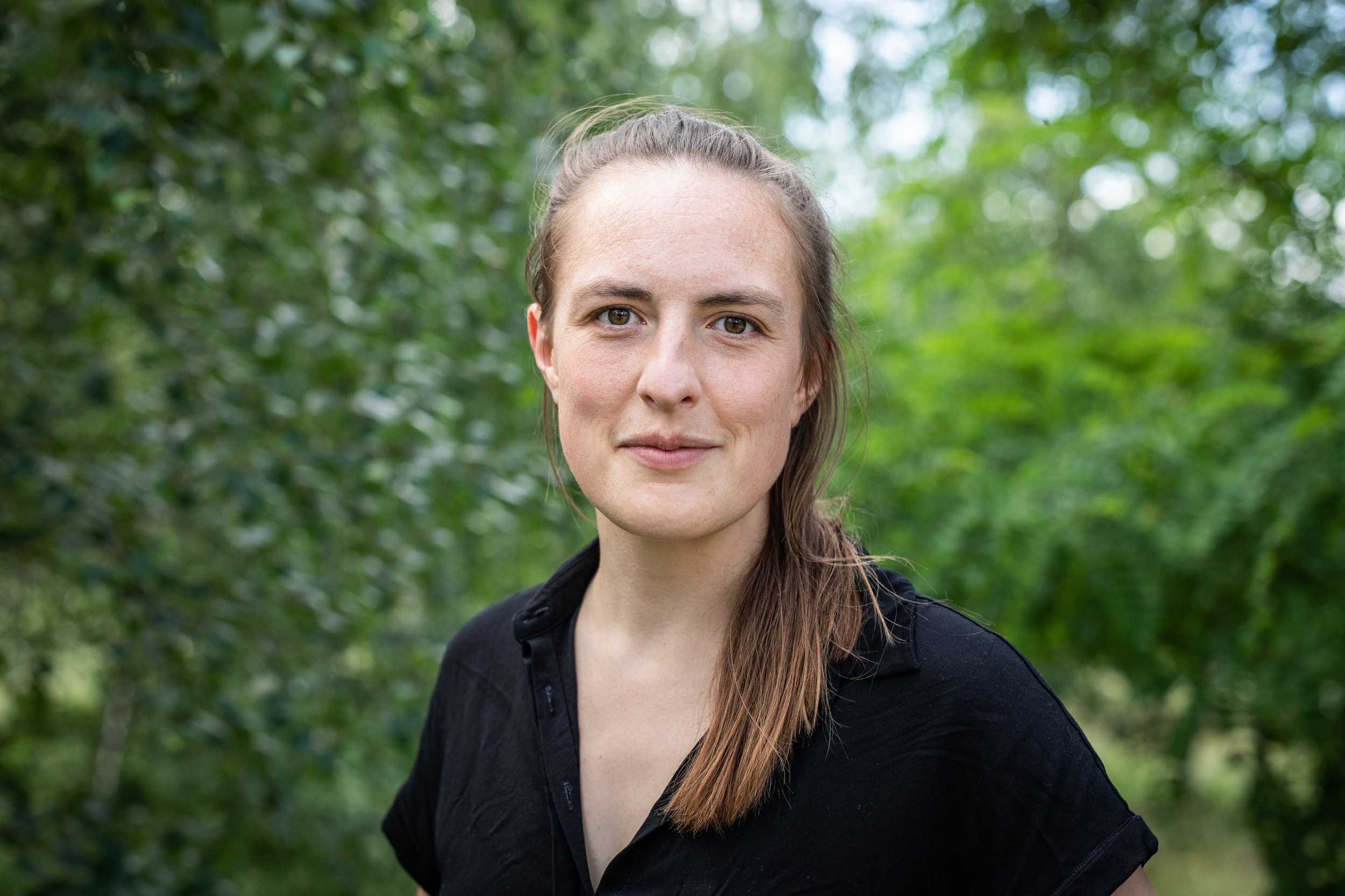 Ein Porträtbild einer jungen Frau mit langen Haaren.