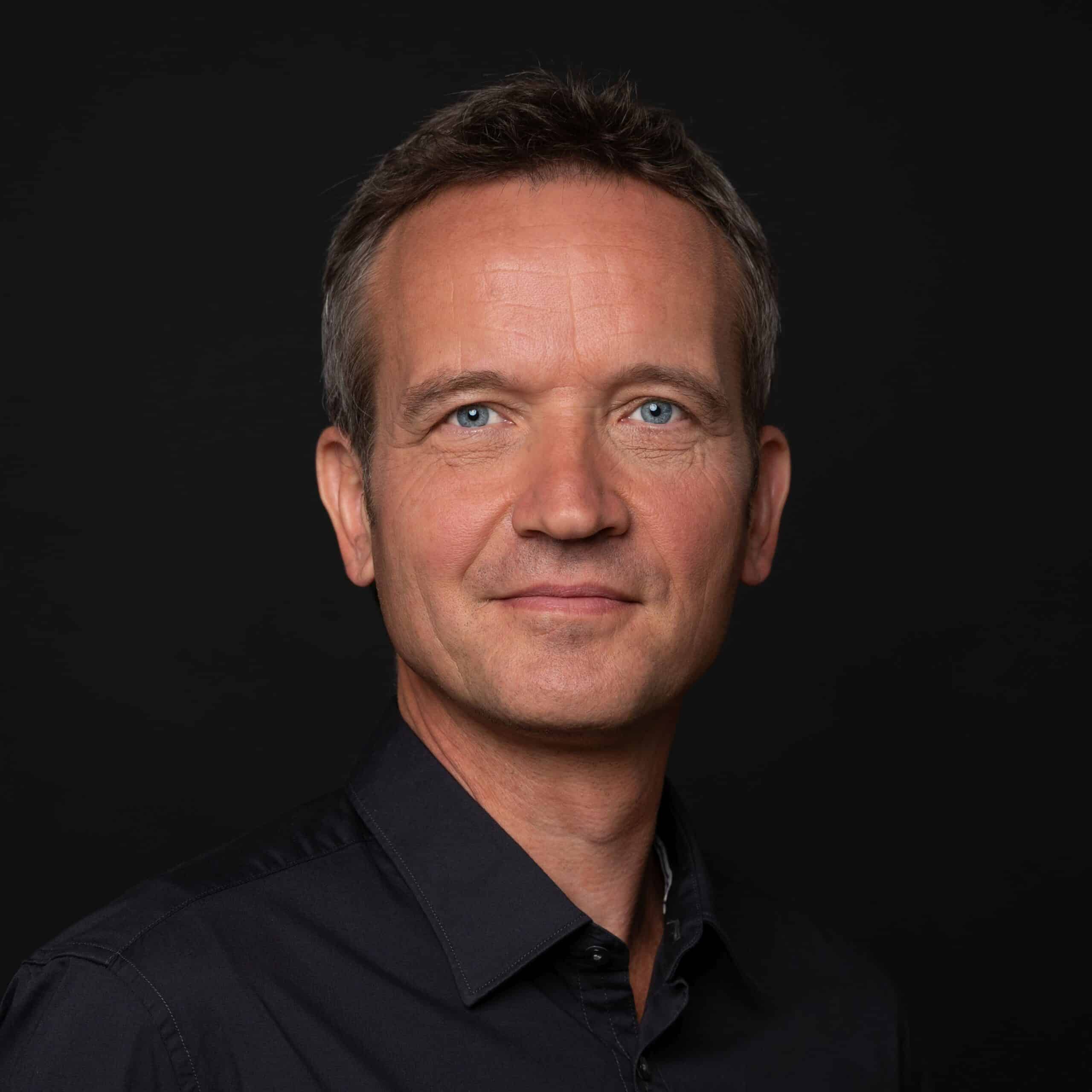 Porträt eines mittelalten Mannes mit dunkelgrauen, kurzen Haar vor dunklem Hintergrund.